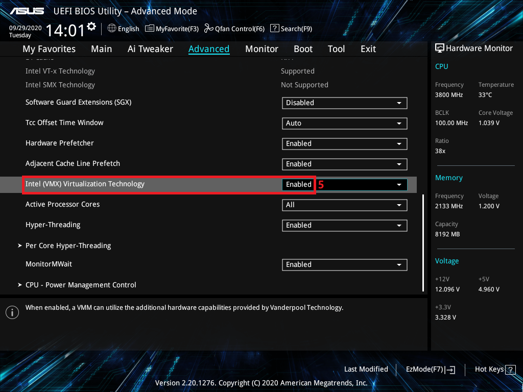 4. 点选[Intel(VMX) Virtualization Technology]选项并设置为[Enabled]