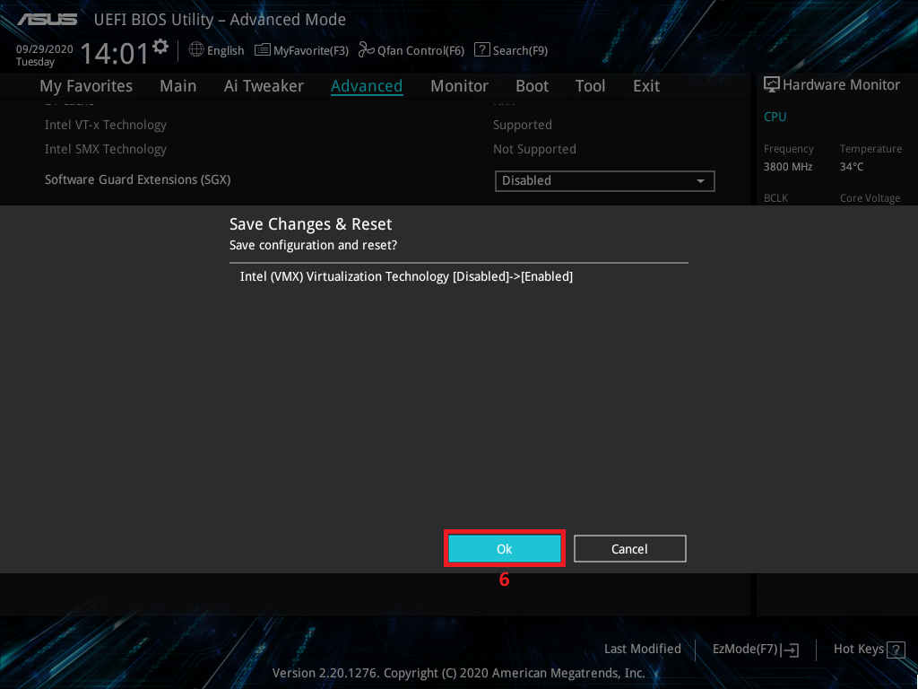 5. 按压键盘F10键,点击[Ok],保存选项,待电脑重启后,即完成BIOS设置