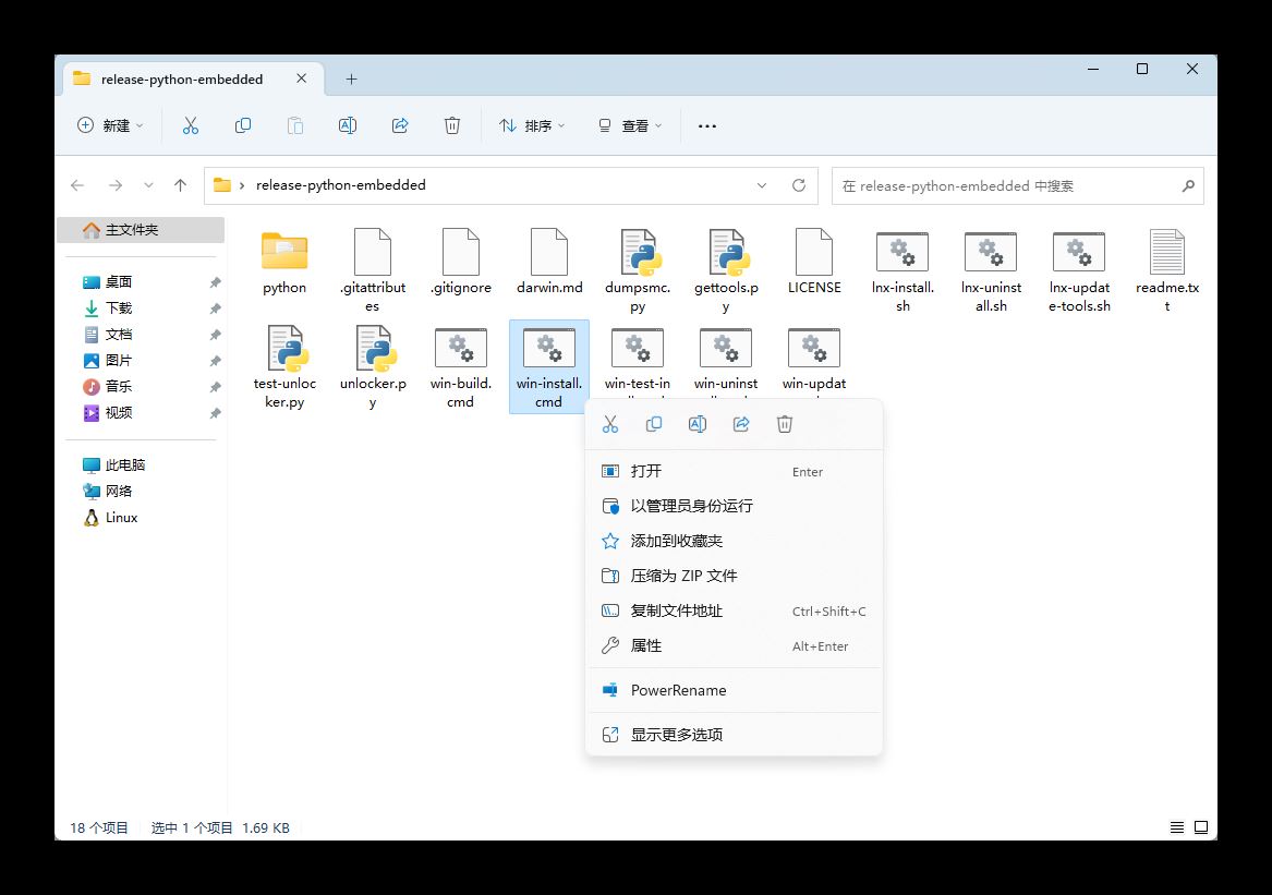1、下载并解压 Unlocker 补丁工具 – 鼠标右击 win-install.cmd 选择「以管理员身份运行」。