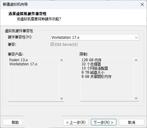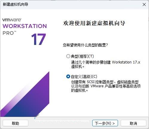 1、点击「创建新的虚拟机」按钮 – 选择「自定义(高级)」- 硬件兼容性选择「Workstation 17.x」。