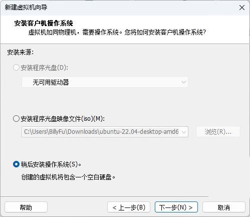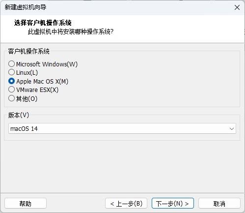 2、选择「稍后安装操作系统」- 选择「Apple Mac OS X」作为客户机操作系统 – 然后选择「macOS 14」作为版本。