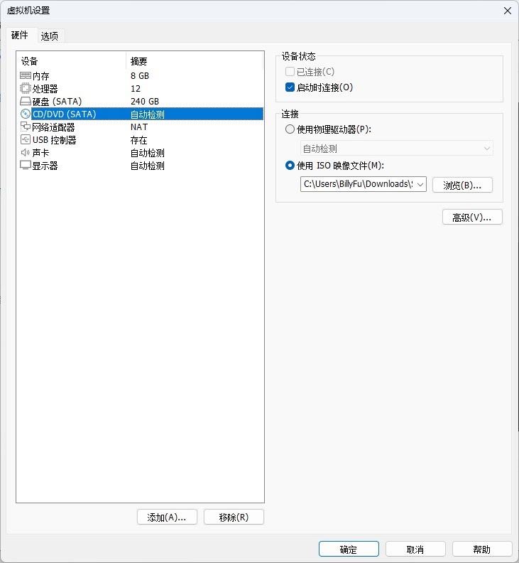5、挂载「步骤 1」创建的 ISO 镜像文件并勾选「启动时连接」。