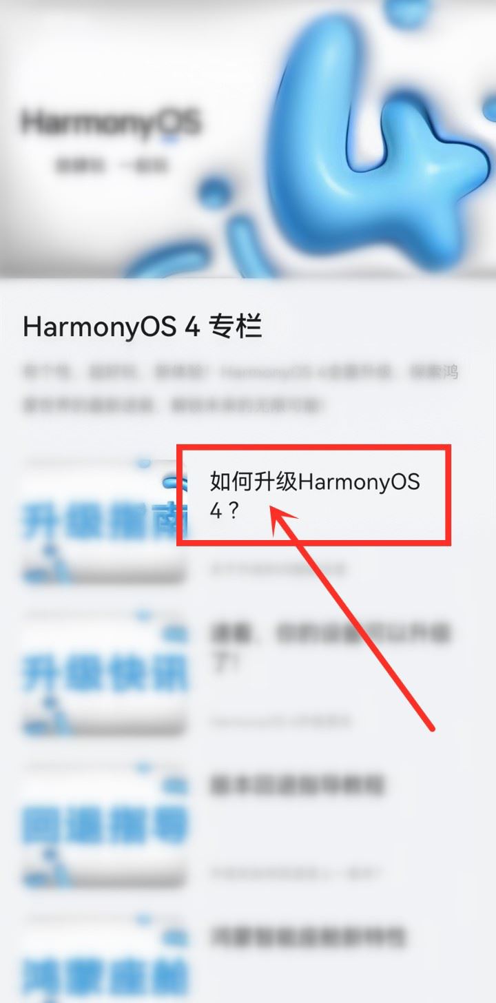 进入鸿蒙4.0专栏,点击“如何升级HarmonyOS 4”选项。