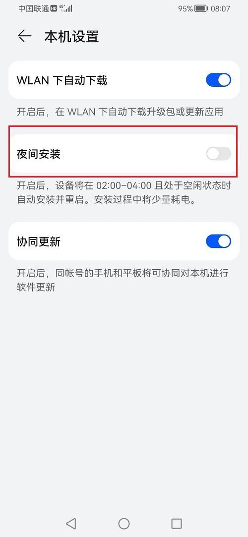 进去本机设置之后,点击关闭夜间安装,就成功关闭鸿蒙系统夜间安装了,根据需要使用