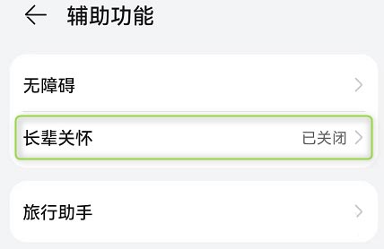 点击进入到辅助功能即可找到“长辈关怀”模式,不过这个模式默认的都是关闭状态,我们需要手动打开才行;