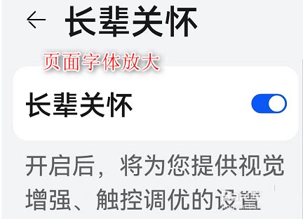 开启方法也很简单,只需要将下图一长辈关怀右侧的悬浮按钮打开即可,接着页面中的字体就会马上变大;