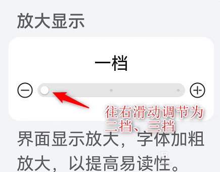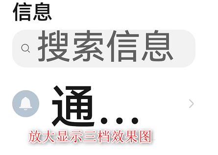而且放大显示的效果还可以自由调节,系统共分为三档,默认的是一档,往右滑动就能调节为二档和三档了,这样字体也会越来越大;