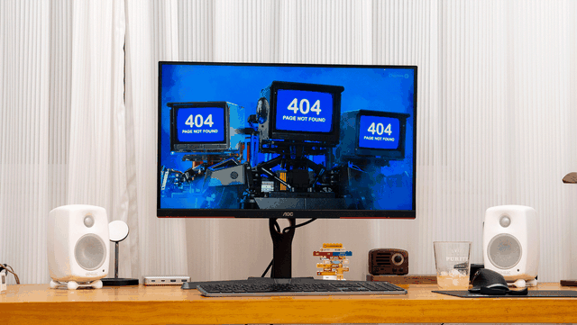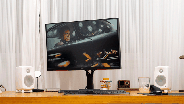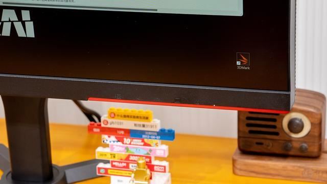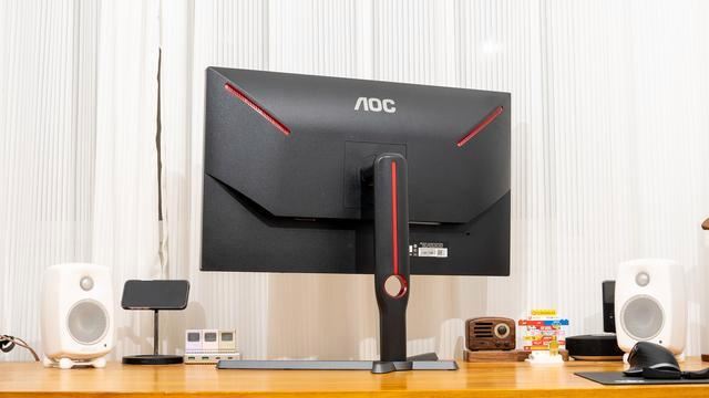 俯看显示器效果,因为内部有2304颗灯珠以及QD-MiniLED 面板所以俯看下会感觉略厚。当然这样做还有一个好处就是,AOC U27G3XM 显示器采用了内置适配器设计。相比需要拖块砖头适配器的显示器来讲,我更喜欢这样内置电源适配器的显示器产品。