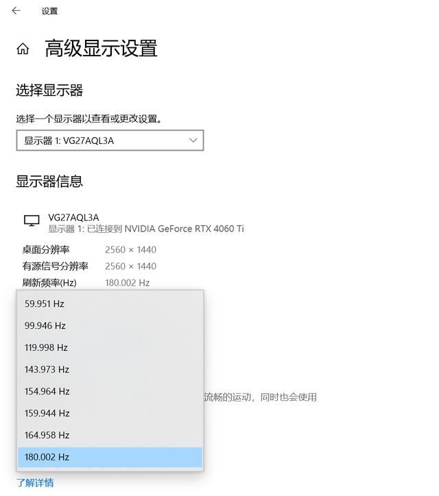 华硕VG27AQL3A支持最高180Hz的刷新频率,可以降低画面延迟,减少动态模糊。我的显卡是NVIDIA GeForce RTX 4060 Ti,完全支持华硕VG27AQL3A性能的完全发挥,并且可以根据个人实际使用需求,选择60-180Hz的8档刷新率调节。
