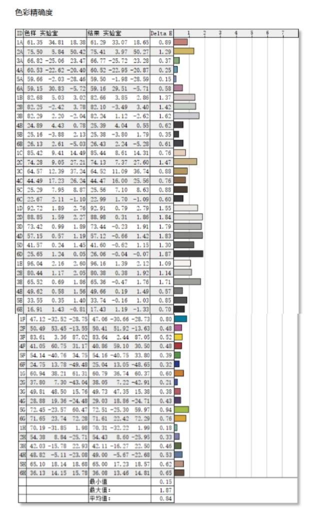 色彩精确度表现很亮眼,最小值0.15,最大值1.87,平均值0.84是很多专业设计显示器的表现水平了。