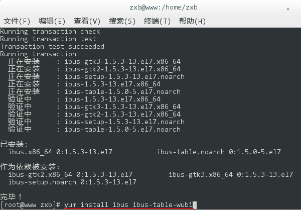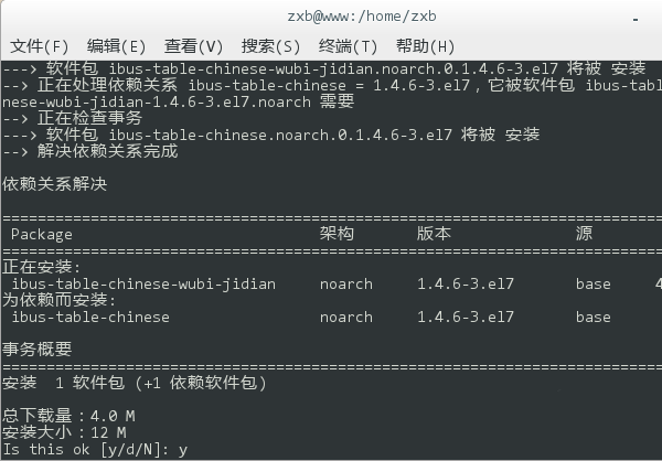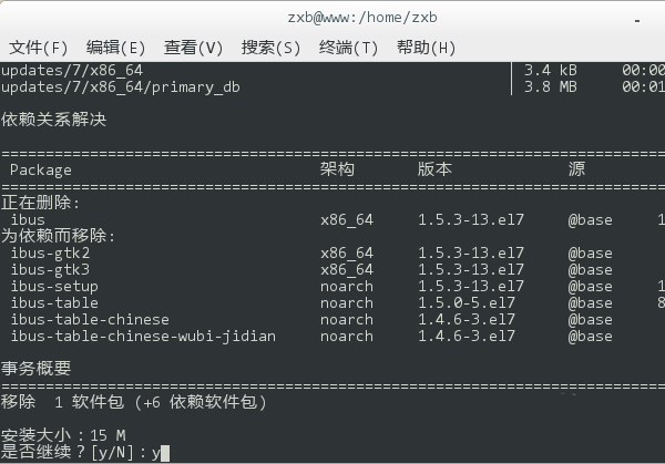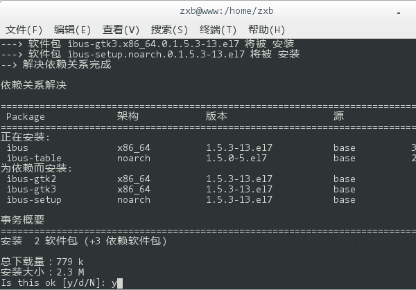 5、移除完毕后,再键入 yum install ibus ibus-table,回车后重新安装输入法框架。同样,在执行过程中会询问是否确认安装,键入 y 回车继续。