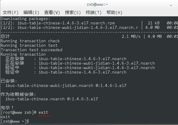 7、安装成功后,键入 exit 退出 root 帐号,然后再关闭终端窗口。当然,你也可以不退出直接关闭终端(这会在关闭时弹出一个警告提示框,直接无视即可),这是没有关系的。