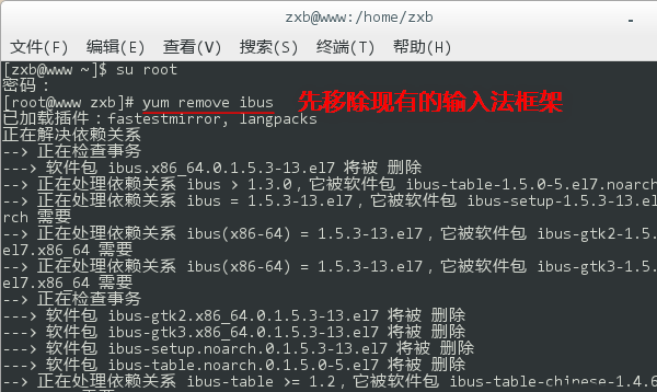 3、登录 root 后,再键入 yum remove ibus,移除现有的输入法框架。