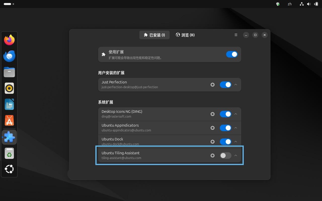 1、打开 GNOME 扩展管理器,在「已安装」标签页中禁用「Ubuntu Tiling Assistant」,以避免产生冲突。