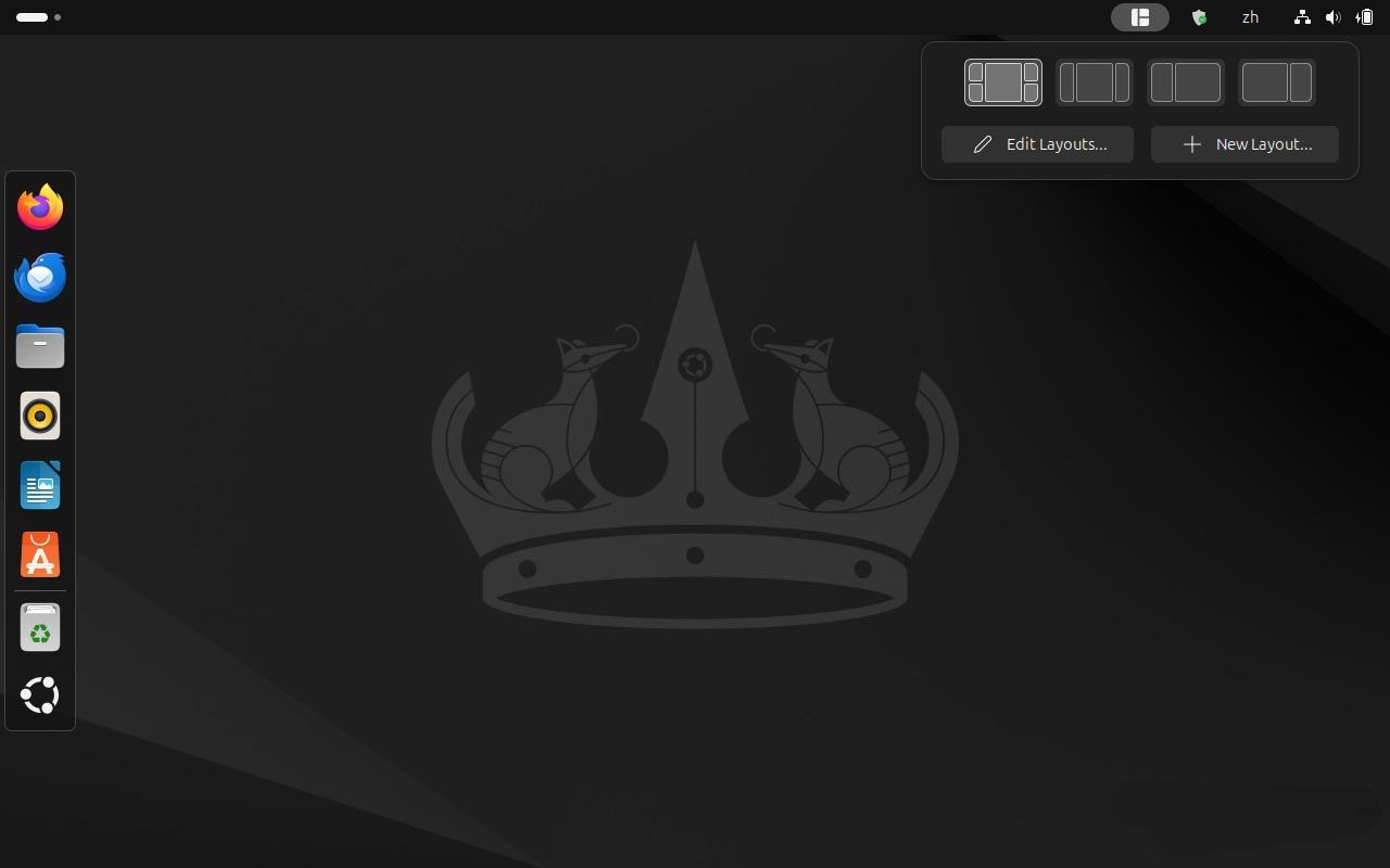 3、安装并启用后,你可以在系统托盘中看到「Tiling Shell」图标,点击图标可以选择预设的布局,或创建新布局。
