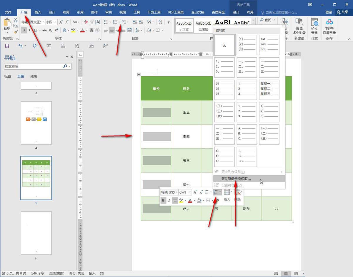 第二步:选中需要输入编号的单元格,点击自动出现的浮动工具栏中如图所示的编号图标,然后点击“定义新编号格式”,或者选中单元格后在“开始”选项卡中点击编号格式,然后同样地选择“定义新编号格式”;