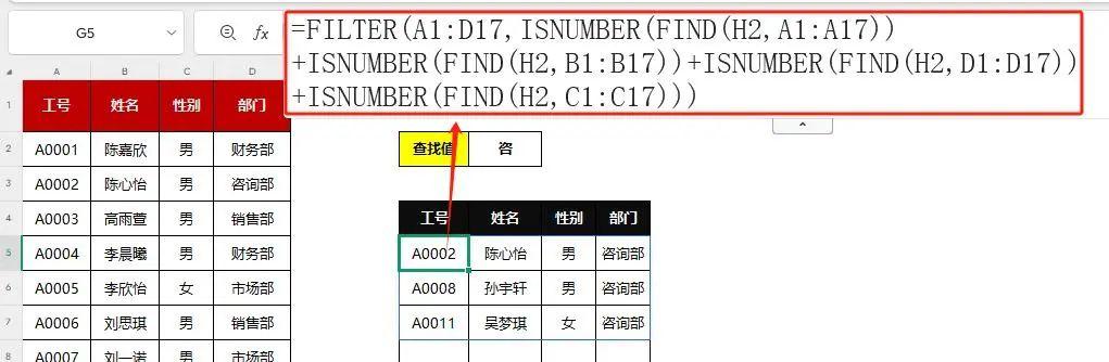 只需要在H2单元格里输关键字,公式不需要更改,就能显示查找结果,也不需要再进行切换着筛选了。