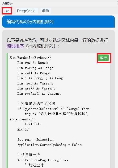 第二步:接着我们选择lke,向AI提出我们需要找寻的问题“编写代码对行内随机排列”,发送问题后AI会提供一种或多种VBA代码方案,我们可以选择其中一个进行执行,这时只要点击绿色的 运行 按钮即可。