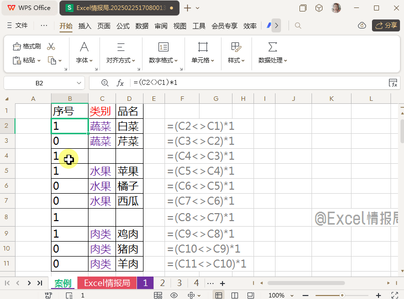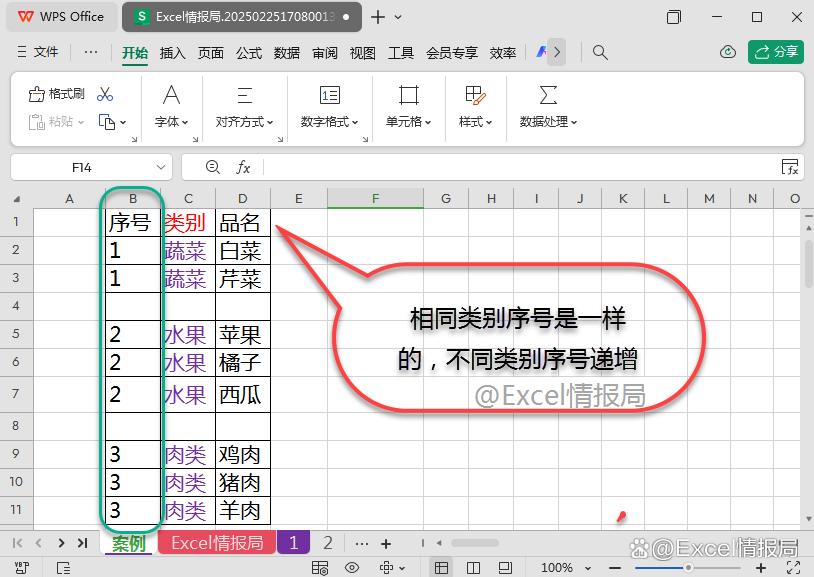 我们观察到,其实不同类别之间的那个空行间隔所对应的序号(标黄区域),我们是不需要的。假如当我们手动去掉这些序号时,我们就得到了最终想要的效果:相同的类别序号一样,不同的类别之间序号是由1~N顺序递增的。