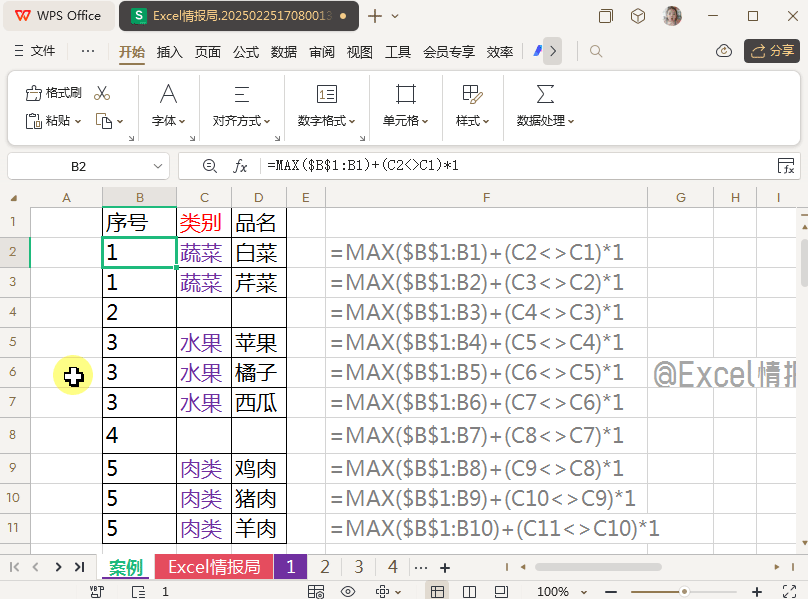 - B8→MAX($B$1:B7)+(C8<>C7)*1→3+1=4