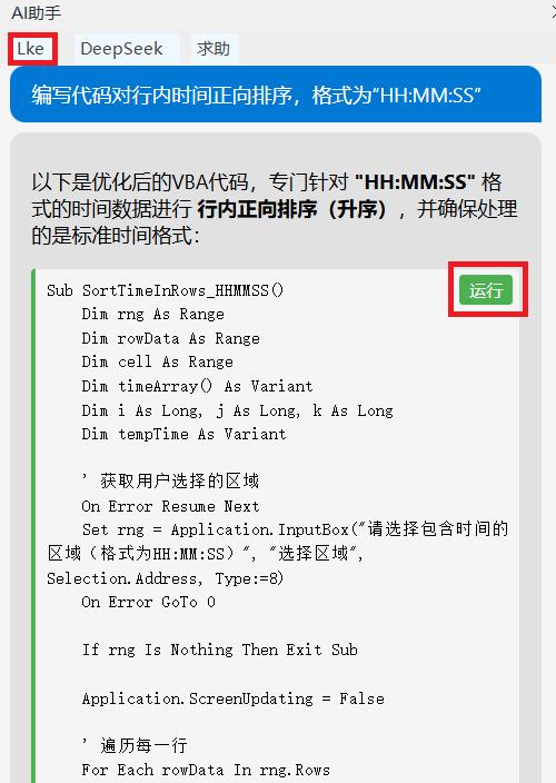 第二步:接着我们选择lke,向AI提出我们需要找寻的问题“编写代码对行内时间正向排序”,可同时加上细节(如示例中时间的格式),AI会提供多种VBA代码方案,我们可以选择其中一个,然后点击绿色的 运行 按钮即可。