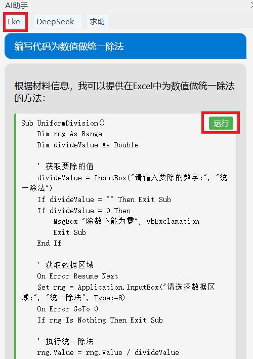 第二步:接着我们选择lke,向AI提出我们需要找寻的问题“编写代码为数值做统一除法”,发送问题后AI会提供一种或多种VBA代码方案,我们可以选择其中一个合适的方案,这时只要点击绿色的 运行 按钮即可执行任务。