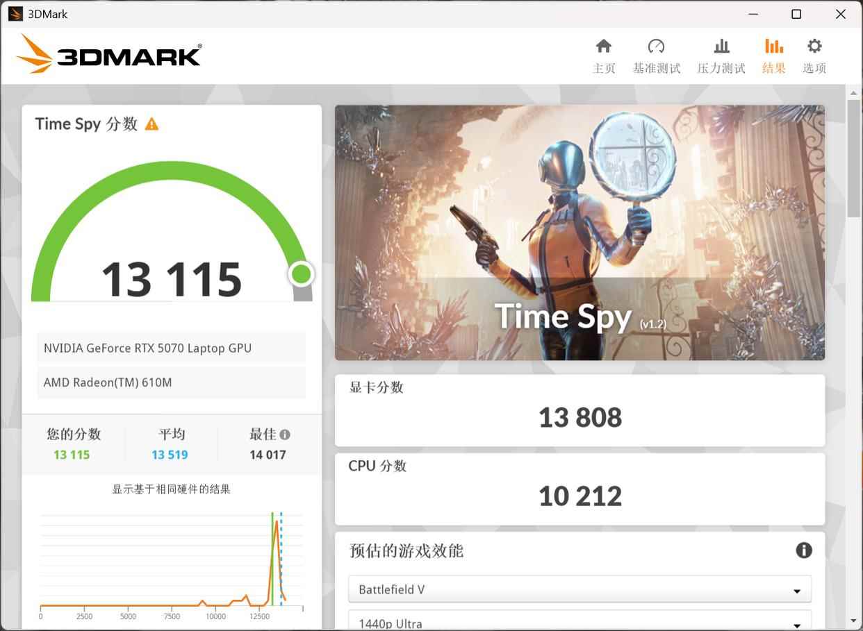 在3DMark的Time Spy中,蛟龙16Z Pro总分为13115分,其中显卡分数13808分,处理器分数10212分,可见RTX5070发挥出了其应有的水平。