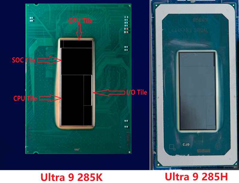 酷睿Ultra 9 285H核心,从左到右依次是GPU Tile、SOC Tile、CPU Tile和 I/O Tile。