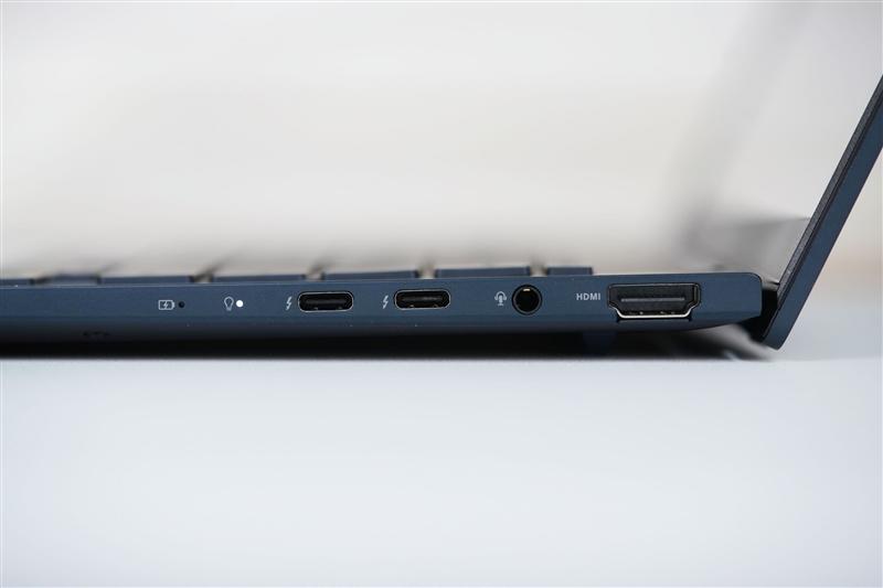 机身右侧有一个HDMI 2.1 TM DS 接口,2个40Gbps的雷电4接口,一个3.5mm耳麦合一接口。