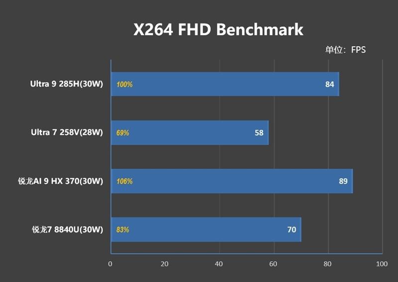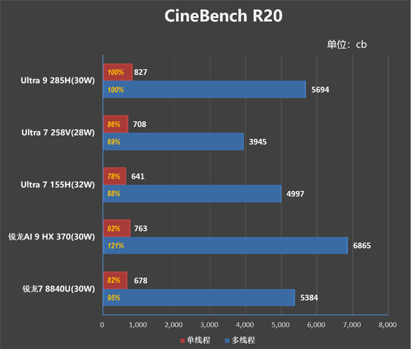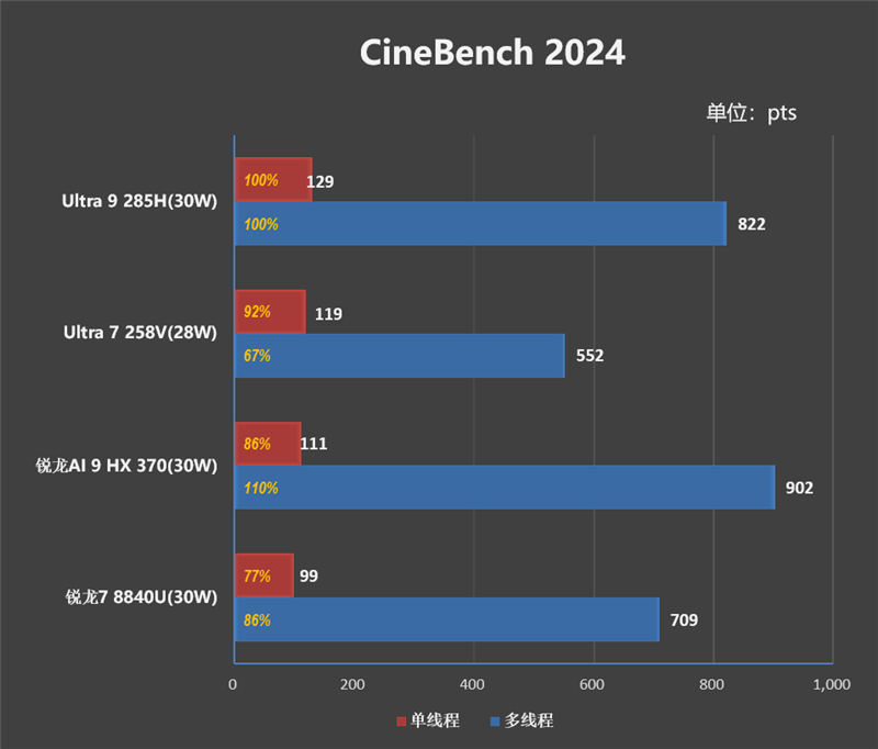 30W的酷睿Ultra 9 285H拥有最强的单核性能,比酷睿Ultra 7 155H强了20%左右,比AMD锐龙AI 9 HX 370强了10%左右。