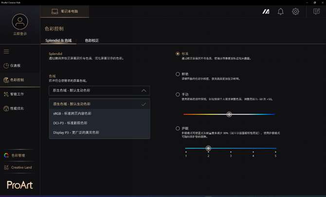 为了满足不同创作者的习惯,ProArt创16 2025为我们提供了四种专业色域:原生色域、sRGB、DCI-P3和Display P3广色域,并且右侧还能手动调整不同的色彩。