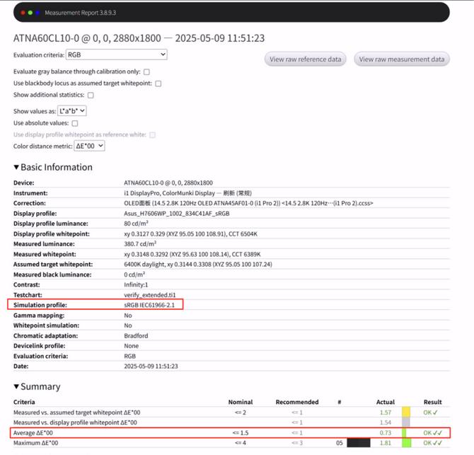 后续我们使用校色仪进行测试,实际测试结果如下: