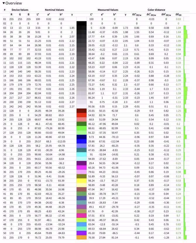sRGB色域覆盖下可以看到,这块屏幕拥有很好的色彩表现,其中色准△E仅为0.73,各个色块的表现均在合理的范围内。