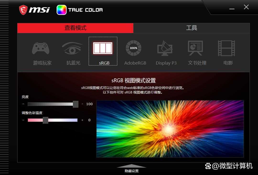 微星绝影16 AI+锐龙版采用一块16英寸的IPS釉月屏,屏幕分辨率达到2560×1600,搭配240Hz超高刷新率和100% DCI-P3广色域覆盖面积,能够为用户带来出色的显示效果,无论是办公还是玩游戏都能体验到细致壮丽的视觉享受。值得一提的是,微星绝影16 AI+锐龙版还支持True Color,可在True Color软件中进行色域切换和色彩调整:比如在浏览网页时可以选择sRGB模式,剪片时可以选择Display P3模式。