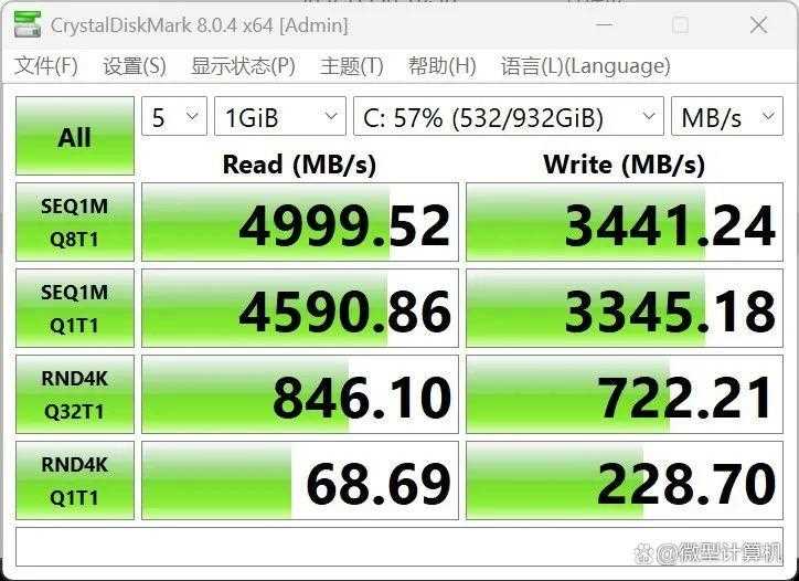 作为一款轻薄全能本,为了让机身更加轻薄,这台机器采用板载的32GB LPDDR5X 7500双通道内存,尽管用户无法更换或者升级内存,但是32GB的容量也能满足绝大多数玩家的使用需求。SSD方面,这台机器采用1TB PCIe 4.0 SSD,从测试来看它的SSD顺序读取速度达到4999.52MB/s,顺序写入速度达到3441.24MB/s,表现不错。