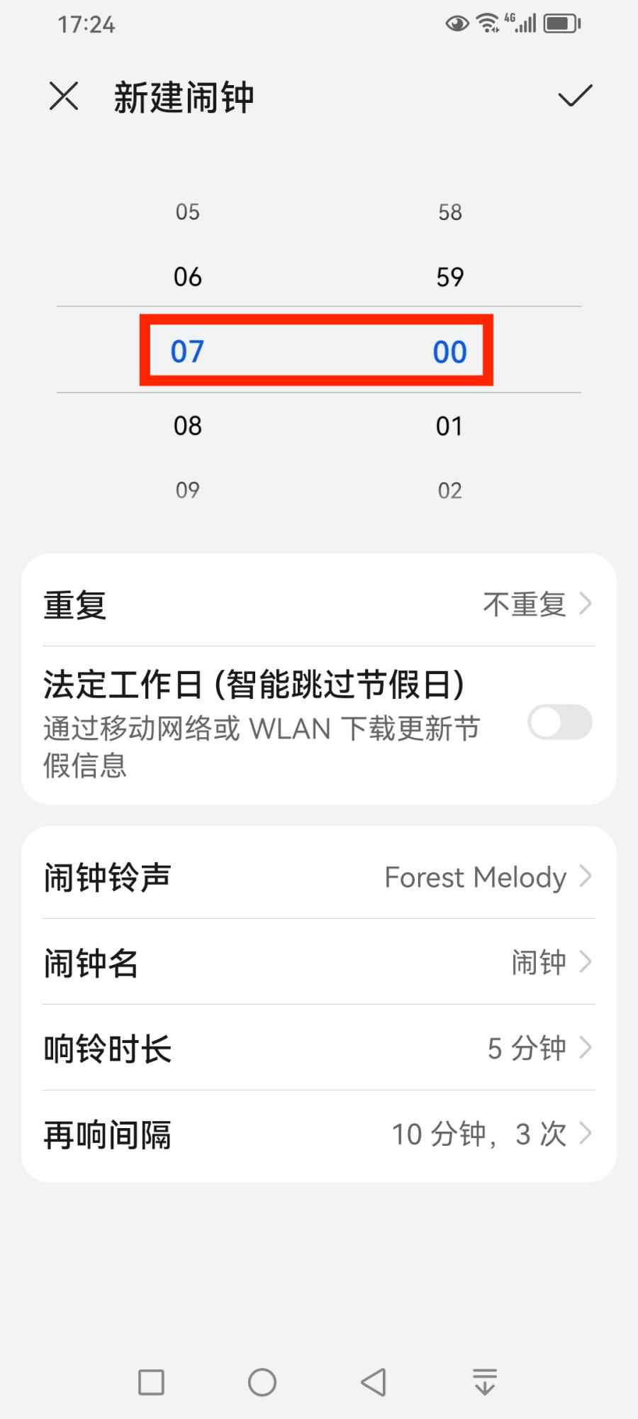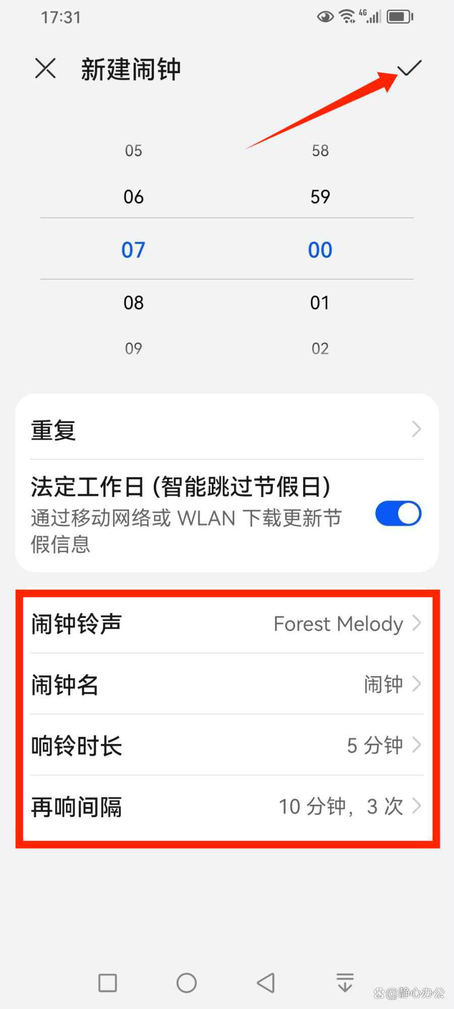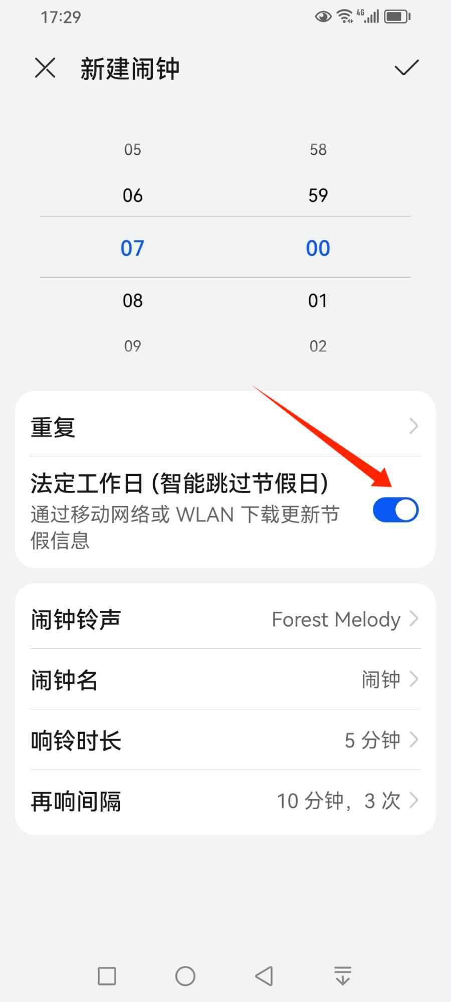 设置闹钟的重复时间,假如我们希望闹钟在所有法定工作日早上7:00重复,可以开启【法定工作日(智能跳过工作日)】功能按钮。