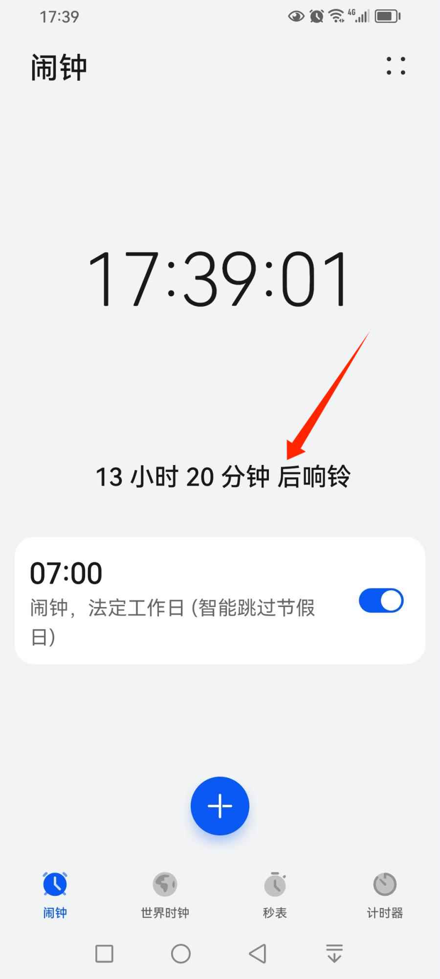 闹钟设置好后,可以在【闹钟】设置界面看到定好的闹钟及下一次闹钟响铃的间隔时间。
