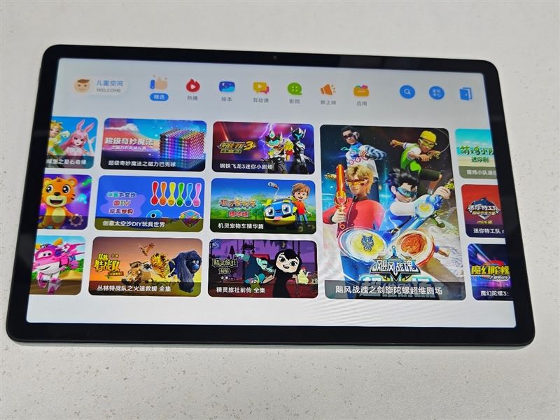 在这个界面下,丰富多彩的画面更容易引起小朋友的兴趣,体验也非常友好,可细分为互动、影视、绘本等多个项目,可满足儿童使用平板观影、学习等多重需求。