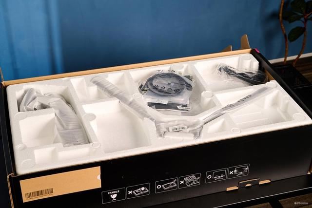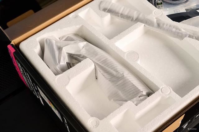 显示器内部是定制的高密度泡沫板,升降支架与脚架分别以珍珠棉袋保护。