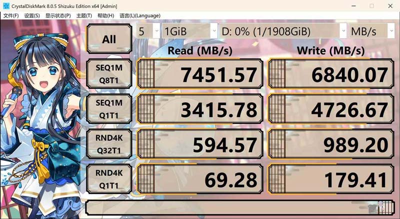 从测试结果可以看出,金百达KP270的顺序读取速度达到了 7451MB/s,超过官方标称值7400MB/s,顺序写入速度为 6840MB/s,略低于官方标称值6900MB/s,总体来说,与理论值差异不大,官方的宣传没有夸大。
