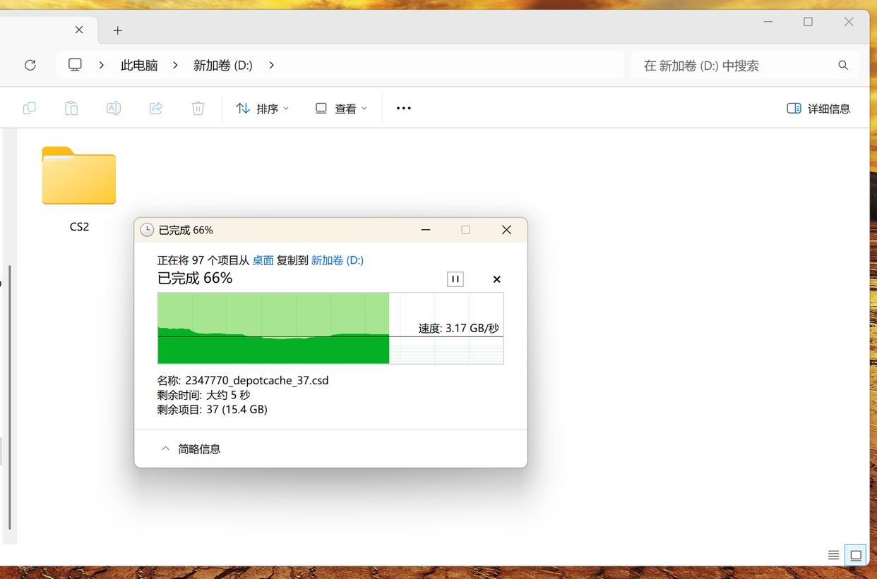 再来看看实际传输场景,这里我把62G的游戏文件夹从C盘拷贝到金百达KP270的D盘,它的平均速度稳定维持在3GB-3.3GB之间,从上图示中也能够清晰地看到,速度曲线比较平稳,整个过程直至后期都没有出现掉速的情况。