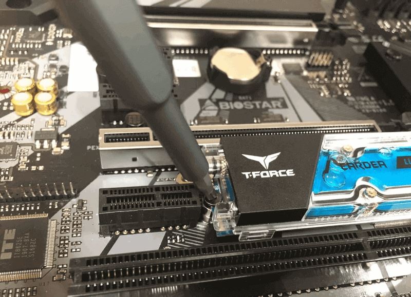 步骤2.将M2固态硬盘以倾斜角度插入连接器,然后根据M2固态硬盘插槽的位置轻轻按下,然后然后使用十字螺丝刀稍微拧紧螺钉以固定M2固态硬盘。