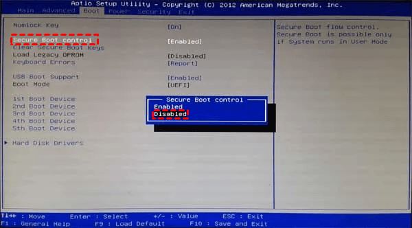 注意:有些主板只有Secure Boot,但没有Secure Boot Control选项,在这种情况下,您只需在Secure Boot中将设置更改为“Disable”即可。