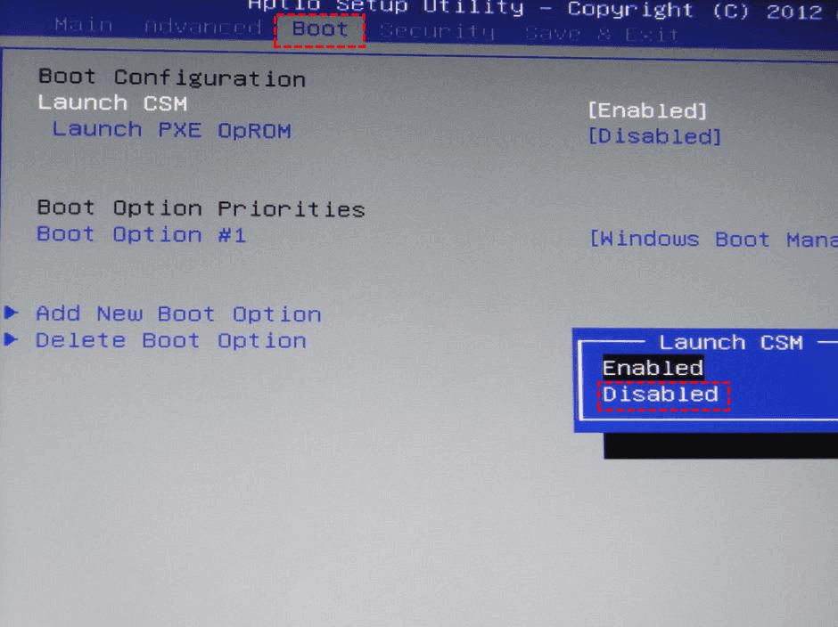 步骤2.在“BOOT”选项中找到“Launch CSM”选项,然后将其设置为“Disable”。