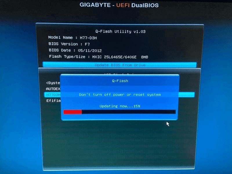 步骤3.按相应的按钮进入BIOS界面,选择从驱动器更新BIOS选项,然后选择从USB闪存驱动器下载的BIOS更新文件,确认此操作并等待更新完成。