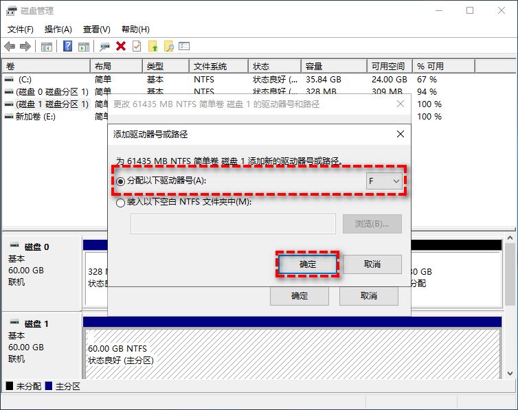 步骤3.在新窗口中,点击“添加”按钮,选择“分配以下驱动器号”,然后在列表中选择一个驱动器号,然后点击“确定”以保存更改。