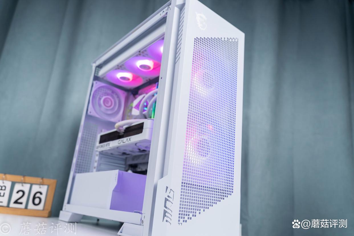 机箱是微星的刀锋300,这款机箱前部有大面积的金属冲孔网,内部标配两把160mm规格的机箱风扇,机箱风扇的扇叶采用双层设计,支持ARGB灯效,支持主板同步。