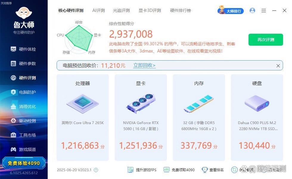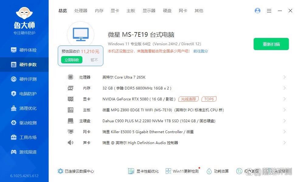 整机配置一览,处理器是265K,主板是微星的Z890刀锋,显卡是影驰的RTX5080金属大师白金版OC,整机配置还是非常给力的。