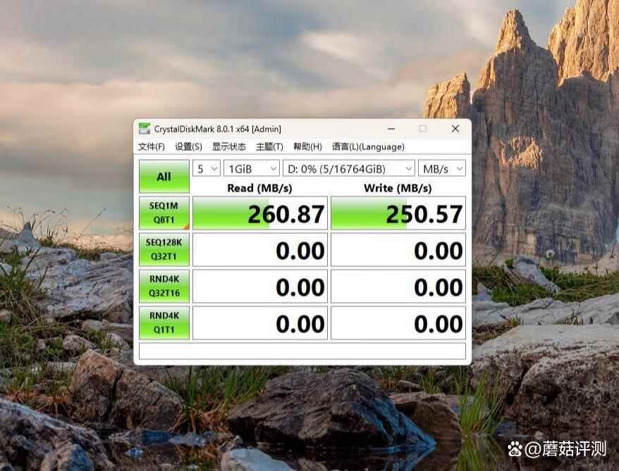 换个DiskMark测试,顺序读取速度在260MB/s,写入速度在250MB/s。