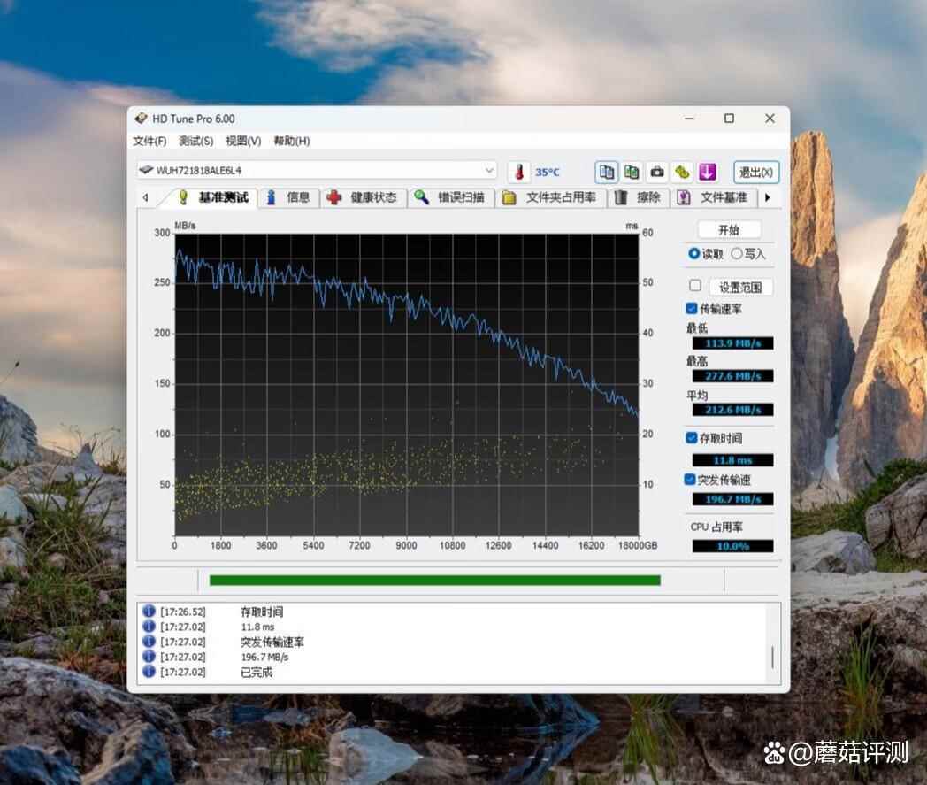 跑个HD Tune Pro的基准测试,速度曲线表现不错,峰值速度能去到277MB/s。
